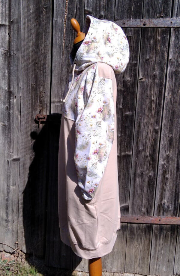 Dámské mikinošaty Něha na křídlech květin s kapsami a kapucí ušité z krásné teplákoviny French Terry – z rubové strany jemná smyčková úprava.